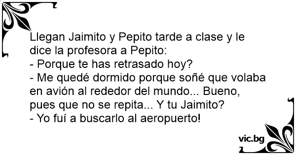 - Me quedé dormido porque soñé que volaba en avión al rededor del mundo... Bueno, pues que no se repita... Y tu Jaimito?