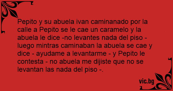 Pepito y su abuela ivan caminanado por la calle a Pepito se le cae un caramelo y la abuela le dice -no levantes nada del piso - luego mintras caminaban la abuela se cae y dice - ayudame a levantarme - y Pepito le contesta - no abuela me dijiste que no se levantan las nada del piso -.