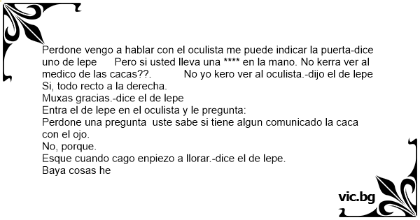 Perdone vengo a hablar соn el oculista me puede indicar la puerta-dice uno de lepe Pero si usted lleva una **** en la mano. No kerra ver al medico de las cacas??. No yo kero ver al oculista.-dijo el de lepe
