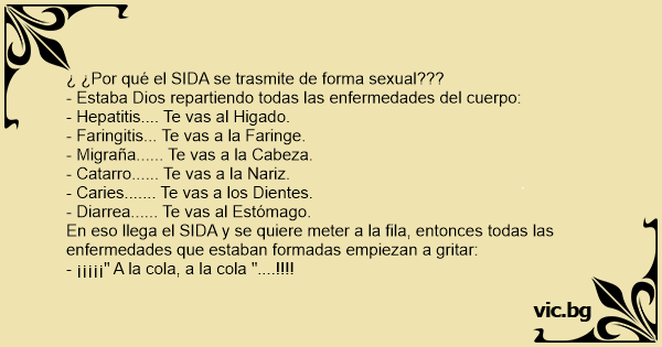 En eso llega el SIDA y se quiere meter a la fila, entonces todas las enfermedades que estaban formadas empiezan a gritar: