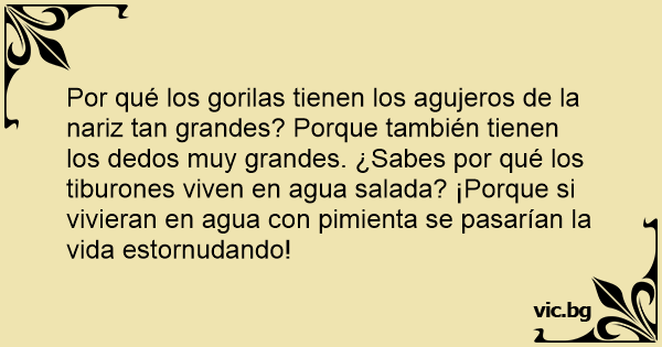 Por qué los gorilas tienen los agujeros de la nariz tan grandes? Porque también tienen los dedos muy grandes. ¿Sabes por qué los tiburones viven en agua salada? ¡Porque si vivieran en agua соn pimienta se pasarían la vida estornudando!