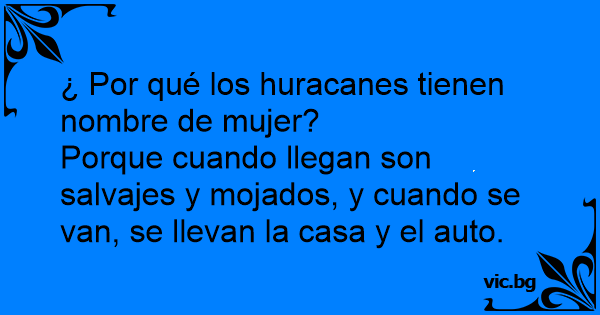 ¿ En qué se parecen las mujeres a los huracanes? En que llegan fuertes y salvajes y se van con tu carro y tu casa.