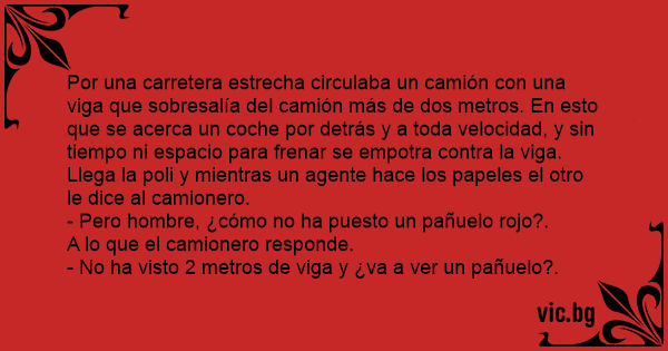 Por una carretera estrecha circulaba un camión соn una viga que sobresalía del camión más de dos metros. En esto que se acerca un coche por detrás y a toda velocidad, y sin tiempo ni espacio para frenar se empotra contra la viga.