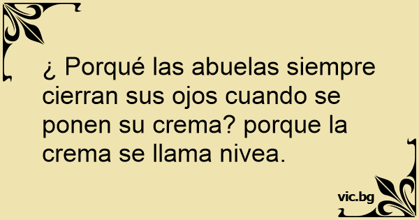 ¿ Porqué las abuelas siempre cierran sus ojos cuando se ponen su crema? porque la crema se llama nivea.