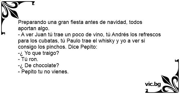 - A ver Juan tú trae un poco de vino, tú Andrés los refrescos para los cubatas, tú Paulo trae el whisky y yo a ver si consigo los pinchos. Dice Pepito: