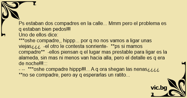 - -- ***oshe compadrepp... A qui ay algo... --por curioso ps lo prueva--- ***hipppp... Y sabe a fresa compadreepp.... ** no мамs.. Compadre como crees.... A ver dejame provar.... Mmmmm.... No compadre, sabe a pera... ***q no compadre,, sabe a fresa... **q no,, sabe a pera... --y ps los compadres se la pasan provando y discutiendo. hasta q salen los primeros rayos del sol-- ***no mames compadre ya viste q era?!!!!*** **siiiiii compadreeeee,,, una саса de perroo!! ***no mames compadre... Que suerte que no la pisamos!!!!! hiiippp!!!!