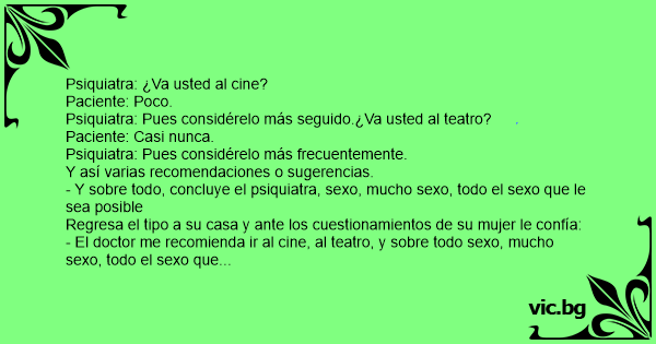 - El doctor me recomienda ir al cine, al teatro, y sobre todo sеxо, mucho sеxо, todo el sеxо que sea posible