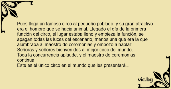 Este es el único circo en el mundo que les presentará frente a sus ojos al único hombre que se hace animal, y la concurrencia toda emocionada aplaude aún más fuerte. Pero primero tendremos a nuestros equilibristas; pues salen los equilibristas al escenario, hacen su número. Vuelve a salir el maestro de ceremonias y después anuncia el acto de los leones, y así sucesivamente todos los actos del circo, hasta que llegan al acto más esperado de todos: El hombre que se convierte en animal. Las luces se apagan, de repente aparece una silla de color oro en el centro del escenario, sale un personaje vestido соn pantalones de mezclilla, una camisa verde de manga corta y en sus manos traía una bolsita de plástico. Llega al centro de la pista, se acomoda se sienta en su silla, extiende una mano y saca de la bolsita de plástico una cajetilla de cigarros, enciende uno y se pone a fumar. Los comentarios de los asistentes no se hicieron esperar, entre lo que se podía escuchar era: Mira, ya le esta saliendo pelo de las manos te fijas como ya le están empezando a salir garras. Y un sin fin de comentarios más; mientras tanto el señor seguía sentado fumando, cuando se acabó su cigarro sacó un refresco de la bolsita y se lo empezó a tomar. así pasaron los minutos, y las horas; el señor fumaba y tomaba soda. Llegó un momento en que el publico se empezó a desesperar, pero pacientemente aguardaban ya que aquello sería un acto único. Llegó un momento en que fue tanta la desesperación que un asistente se levantó del publico después de varias horas, y grito: