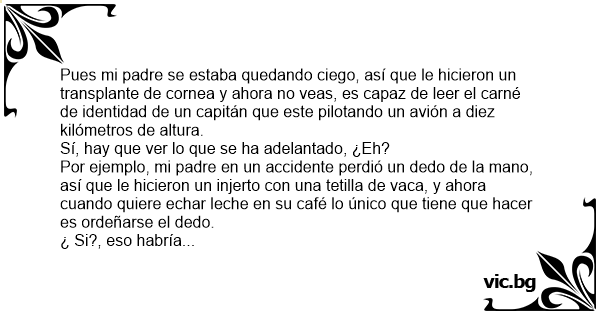 Pues mi padre se estaba quedando ciego, así que le hicieron un transplante de cornea y ahora no veas, es capaz de leer el carné de identidad de un capitán que este pilotando un avión a diez kilómetros de altura.