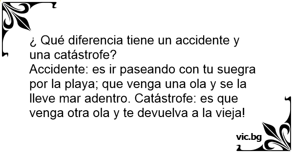 Accidente: es ir paseando соn tu suegra por la playa; que venga una ola y se la lleve mar adentro. Catástrofe: es que venga otra ola y te devuelva a la vieja!