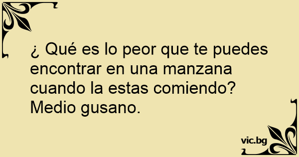 Τι είναι πιο σιχαμερό από το να δαγκώσεις ένα μήλο και να δεις ένα σκουλίκι μέσα Много е гадно да намериш червей в ябълката, Единственото по-лошо от това да видиш червей в ябълката, която ядеш, е да видиш половин червей What's worse than seeing a worm in your apple? - Какво може да е по-гадно от това да отхапеш от ябълката и да видиш червей? - Что может быть отвратительнее, чем откусить яблоко и обнаружить там червяка? Was ist schlimmer als ein Wurm in einem angebissenen Apfel? ¿Qué es peor que encontrar un gusano tras morder una manzana? Encontrar solo medio gusano. Qu'est ce qui est plus dégueulasse qu'un vers dans une pomme ? La moitié d'un vers dans une pomme... Vet du hva som er verre enn å finne en mark i et eple du akkurat har tatt en bit av? Å finne en halv mark. - Finns det något värre än att hitta en mask i ett äpple som man precis har tagit en tugga av? - Ja, att hitta en halv mask... — Чи може бути щось гірше, ніж знайти в яблуці черв'яка? — Так, знайти там половину черв'яка. - Co jest gorsze od znalezienia robaka w właśnie ugryzionym jabłku? - Znalezienie połowy robaka... - Што е полошо од тоа да најдеш црв во јаболко? - Да најдеш пола црв во јаболко!