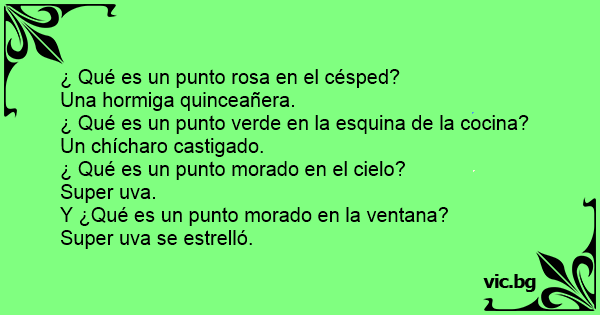 ¿ Qué es un punto rosa en el césped?<br />Una hormiga quinceañera.<br />¿ Qué es un punto verde en la esquina de la cocina?<br />Un chícharo castigado.<br />¿ Qué es un punto morado en el cielo?<br />Super uva.<br />Y ¿Qué es un punto morado en la ventana?<br />Super uva se estrelló.