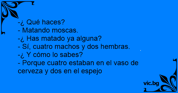 Una mujer llega a casa y se encuentra al marido con un matamoscas en la mano. -¿ Qué haces? Él contesta: - Matando moscas. -¿ Y has matado alguna? -¡ Sí! ¡3 machos y 2 hembras! Intrigada ella le...