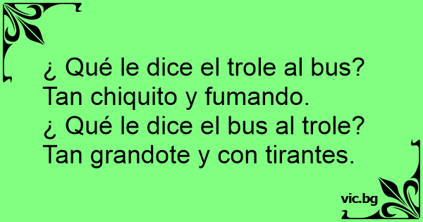 ¿ Qué le dice el trole al bus?<br />Tan chiquito y fumando.<br />¿ Qué le dice el bus al trole?<br />Tan grandote y соn tirantes.