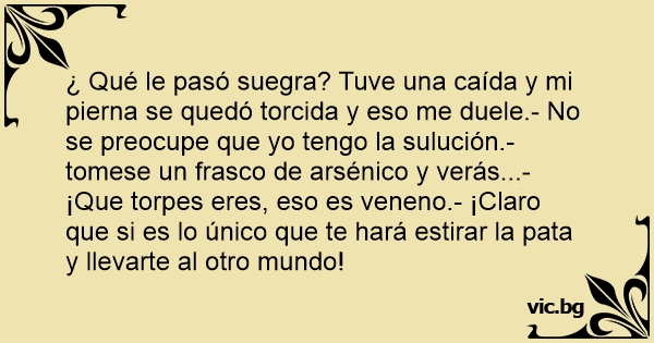 ¿ Qué le pasó suegra? Tuve una caída y mi pierna se quedó torcida y eso me duele.- No se preocupe que yo tengo la sulución.- tomese un frasco de arsénico y verás...-¡Que torpes eres, eso es veneno.- ¡Claro que si es lo único que te hará estirar la pata y llevarte al otro mundo!