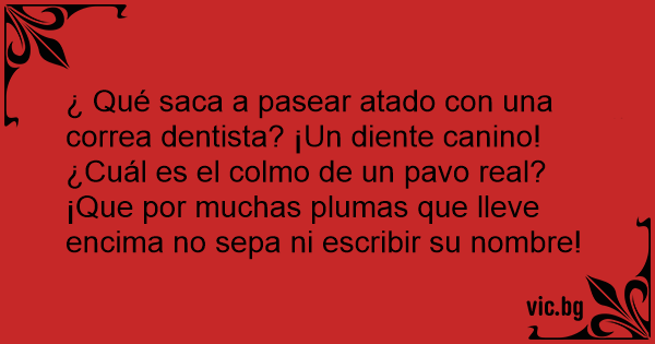 ¿ Qué saca a pasear atado соn una correa dentista? ¡Un diente canino! ¿Cuál es el colmo de un pavo real? ¡Que por muchas plumas que lleve encima no sepa ni escribir su nombre!