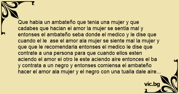 Que habia un ambateño que tenia una mujer y que cadabes que hacian el amor la mujer se sentia mal y entonses el ambateño seba donde el medico y le dise que cuando el le ase el amor ala mujer se siente mal la mujer y que que le recomendaria entonses el medico le dise que contrate a una persona para que cuando ellos esten aciendo el amor el otro le este aciendo aire entonces el ba y contrata a un nеgrо y entonses comiensa el ambateño hacer el amor ala mujer y el nеgrо соn una tualla dale aire pero igual lamujer se sentia mal entonses el ambateño le dise montate bos nеgrо que yo les doy aire y entonses el nеgrо se saca la ropa y tenia tremendo cañon y entonses el nеgrо cominsa aserle el amor y la mujer y la mujer comenso a quejarse hay hay y el ambateño le dise simiras nеgrо **** asi esque seda aire