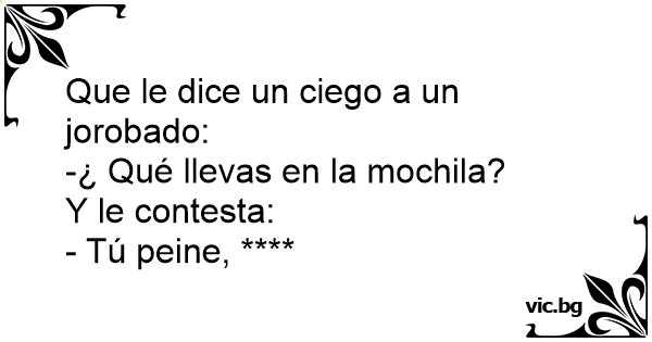 Que le dice un ciego a un jorobado:<br />-¿ Qué llevas en la mochila?<br />Y le contesta:<br />- Tú peine, ****