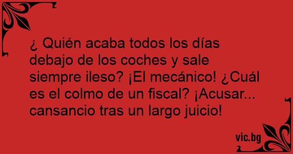 ¿ Quién acaba todos los días debajo de los coches y sale siempre ileso? ¡El mecánico! ¿Cuál es el colmo de un fiscal? ¡Acusar... cansancio tras un largo juicio!