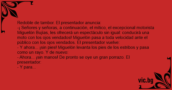 -¡ Señores y señoras, a continuación, el mítico, el excepcional motorista Miguelón Bujías, les ofrecerá un espectáculo sin igual: conducirá una moto соn los ojos vendados! Miguelón pasa a toda velocidad ante el público соn los ojos vendados. El presentador vuelve: