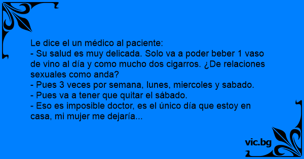 - Su salud es muy delicada. Solo va a poder beber 1 vaso de vino al día y como mucho dos cigarros. ¿De relaciones sexuales como anda?