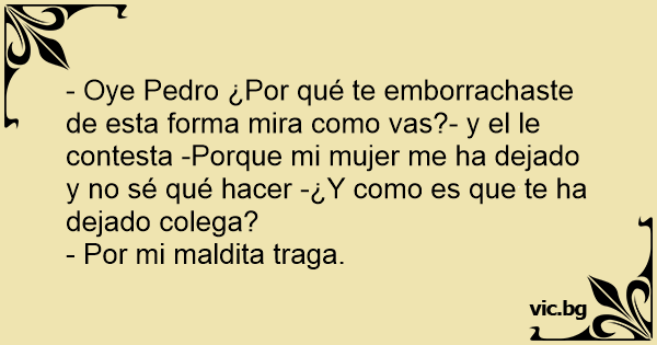 - Oye Pedro ¿Por qué te emborrachaste de esta forma mira como vas?- y el le contesta -Porque mi mujer me ha dejado y no sé qué hacer -¿Y como es que te ha dejado colega?