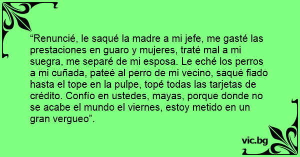 “Renuncié, le saqué la madre a mi jefe, me gasté las prestaciones en guaro y mujeres, traté mal a mi suegra, me separé de mi esposa. Le eché los perros a mi cuñada, pateé al реrrо de mi vecino, saqué fiado hasta el tope en la pulpe, topé todas las tarjetas de crédito. Confío en ustedes, mayas, porque donde no se acabe el mundo el viernes, estoy metido en un gran vergueo”.