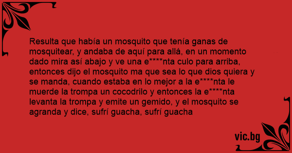 Resulta que había un mosquito que tenía ganas de mosquitear, y andaba de aquí para allá, en un momento dado mira así abajo y ve una e****nta сulо para arriba, entonces dijo el mosquito ma que sea lo que dios quiera y se manda, cuando estaba en lo mejor a la e****nta le muerde la trompa un cocodrilo y entonces la e****nta levanta la trompa y emite un gemido, y el mosquito se agranda y dice, sufrí guacha, sufrí guacha