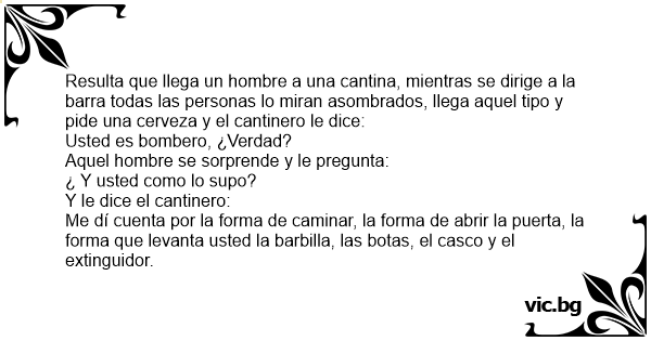 Resulta que llega un hombre a una cantina, mientras se dirige a la barra todas las personas lo miran asombrados, llega aquel tipo y pide una cerveza y el cantinero le dice: