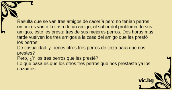 Resulta que se van tres amigos de cacería pero no tenían perros, entonces van a la casa de un amigo, al saber del problema de sus amigos, éste les presta tres de sus mejores perros. Dos horas más tarde vuelven los tres amigos a la casa del amigo que les prestó los perros:
