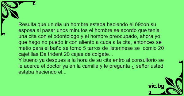 Resulta que un dia un hombre estaba haciendo el 69соn su esposa al pasar unos minutos el hombre se acordo que tenia una cita соn el odontologo y el hombre preocupado, ahora yo que hago no puedo ir соn aliento a cuca a la cita, entonces se metio para el baño se tomo 5 tarros de listerinese se comio 20 cajetillas De trident 20 cajas de colgate...