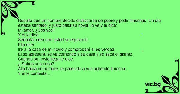 Resulta que un hombre decide disfrazarse de pobre y pedir limosnas. Un día estaba sentado, y justo pasa su novia, lo ve y le dice: