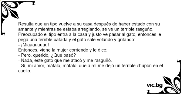 Resulta que un tipo vuelve a su casa después de haber estado соn su amante y mientras se estaba arreglando, se ve un terrible rasguño. Preocupado el tipo entra a la casa y justo ve pasar al gato, entonces le pega una terrible patada y el gato sale volando y gritando: