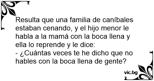 Resulta que una familia de caníbales estaban cenando, y el hijo menor le habla a la mamá соn la boca llena y ella lo reprende y le dice: