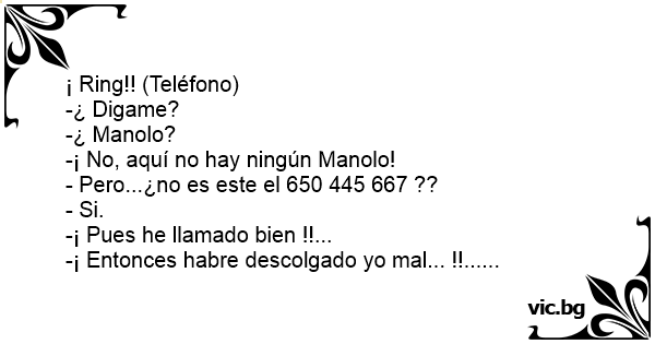 ¡ Ring!! (Teléfono) -¿ Digame? -¿ Manolo? -¡ No, aquí no hay ningún Manolo! - Pero...¿no es este el 650 445 667 ?? - Si. -¡ Pues he llamado bien !!... -¡ Entonces habre descolgado yo mal... !!......