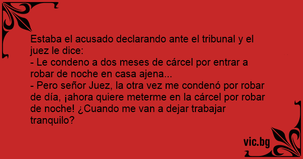 - Pero señor Juez, la otra vez me condenó por robar de día, ¡ahora quiere meterme en la cárcel por robar de noche! ¿Cuando me van a dejar trabajar tranquilo?
