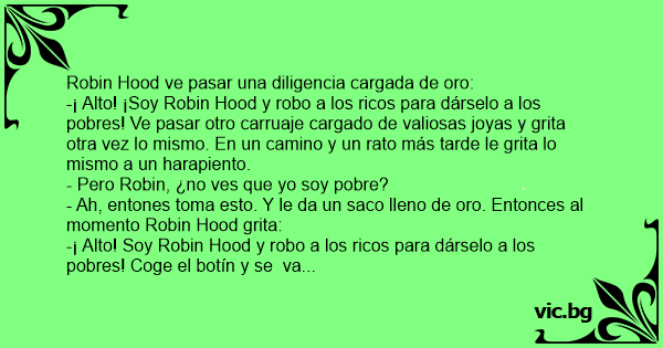 -¡ Alto! ¡Soy Robin Hood y robo a los ricos para dárselo a los pobres! Ve pasar otro carruaje cargado de valiosas joyas y grita otra vez lo mismo. En un camino y un rato más tarde le grita lo mismo a un harapiento.