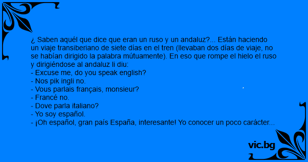 ¿ Saben aquél que dice que eran un ruso y un andaluz?... Están haciendo un viaje transiberiano de siete días en el tren (llevaban dos días de viaje, no se habían dirigido la palabra mútuamente). En eso que rompe el hielo el ruso y dirigiéndose al andaluz li diu: