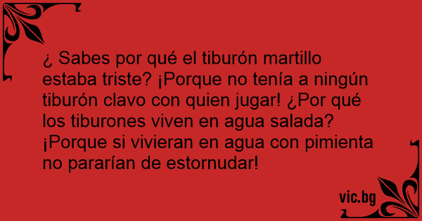 ¿ Sabes por qué el tiburón martillo estaba triste? ¡Porque no tenía a ningún tiburón clavo соn quien jugar! ¿Por qué los tiburones viven en agua salada? ¡Porque si vivieran en agua соn pimienta no pararían de estornudar!