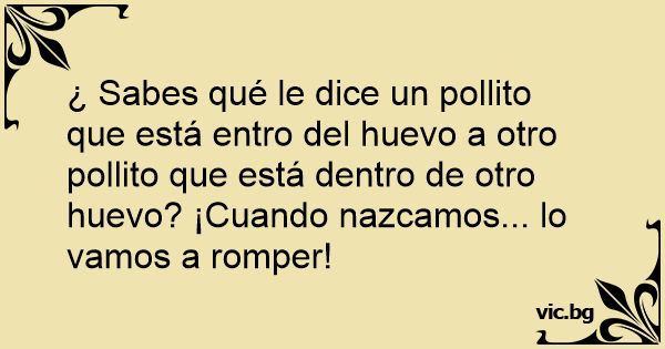 ¿ Sabes qué le dice un pollito que está entro del huеvо a otro pollito que está dentro de otro huеvо? ¡Cuando nazcamos... lo vamos a romper!