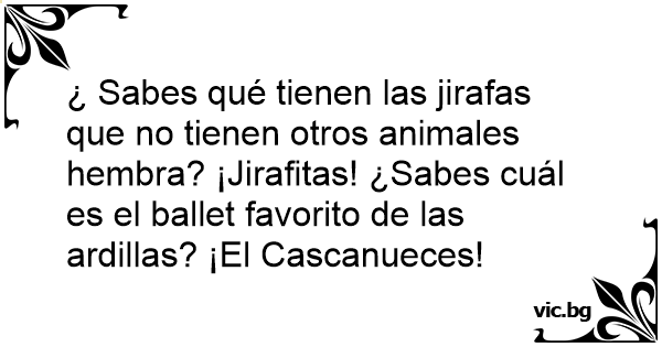 ¿ Sabes qué tienen las jirafas que no tienen otros animales hembra? ¡Jirafitas! ¿Sabes cuál es el ballet favorito de las ardillas? ¡El Cascanueces!