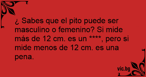 ¿ Sabes que el pito puede ser masculino o femenino? Si mide más de 12 cm. es un ****, pero si mide menos de 12 cm. es una pena.