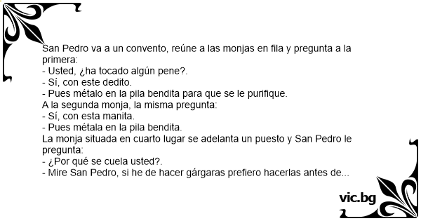 Un grupo de monjitas ha pasando por delante de San Pedro para entrar al cielo. Entonces, San Pedro le pregunta a la primera: - “Hermana Verónica, ¿ha tocado usted un miembro masculino alguna vez?”...