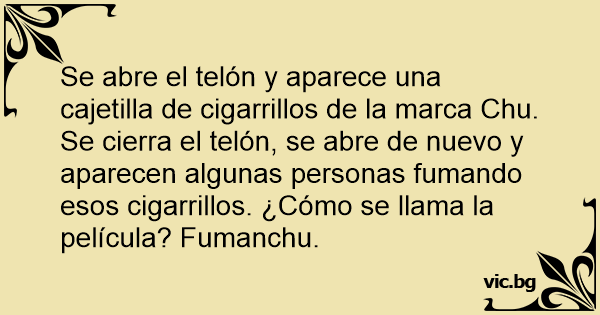 Se abre el telón y aparece una cajetilla de cigarrillos de la marca Chu. Se cierra el telón, se abre de nuevo y aparecen algunas personas fumando esos cigarrillos. ¿Cómo se llama la película? Fumanchu.