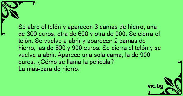 Se abre el telón y aparecen 3 camas de hierro, una de 300 euros, otra de 600 y otra de 900. Se cierra el telón. Se vuelve a abrir y aparecen 2 camas de hierro, las de 600 y 900 euros. Se cierra el telón y se vuelve a abrir. Aparece una sola cama, la de 900 euros. ¿Cómo se llama la película?