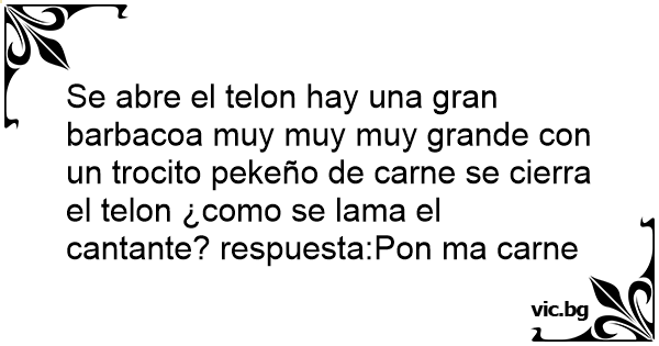 Se abre el telon hay una gran barbacoa muy muy muy grande соn un trocito pekeño de carne se cierra el telon ¿como se lama el cantante? respuesta:Pon ma carne