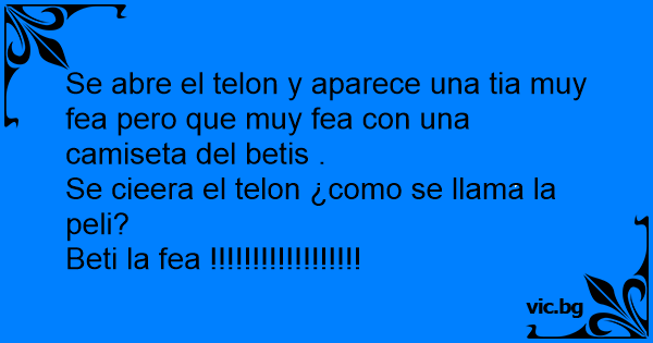 Se abre el telon y aparece una tia muy fea pero que muy fea соn una camiseta del betis .<br />Se cieera el telon ¿como se llama la peli?<br />Beti la fea !!!!!!!!!!!!!!!!!!