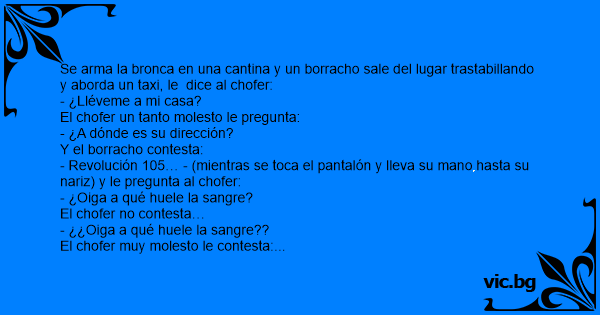 Se arma la bronca en una cantina y un borracho sale del lugar trastabillando y aborda un taxi, le dice al chofer:
