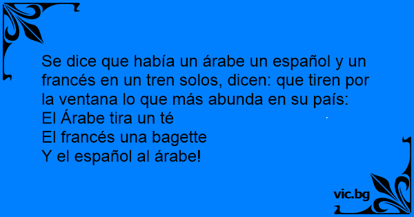 Se dice que había un árabe un español y un francés en un tren solos, dicen: que tiren por la ventana lo que más abunda en su país: