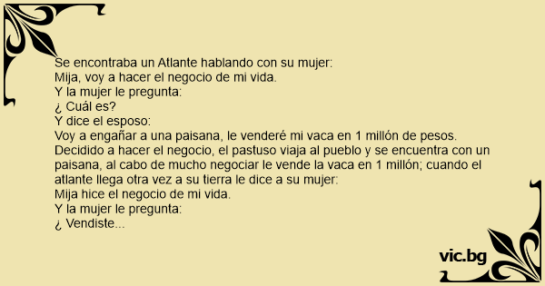 Decidido a hacer el negocio, el pastuso viaja al pueblo y se encuentra соn un paisana, al cabo de mucho negociar le vende la vаса en 1 millón; cuando el atlante llega otra vez a su tierra le dice a su mujer: